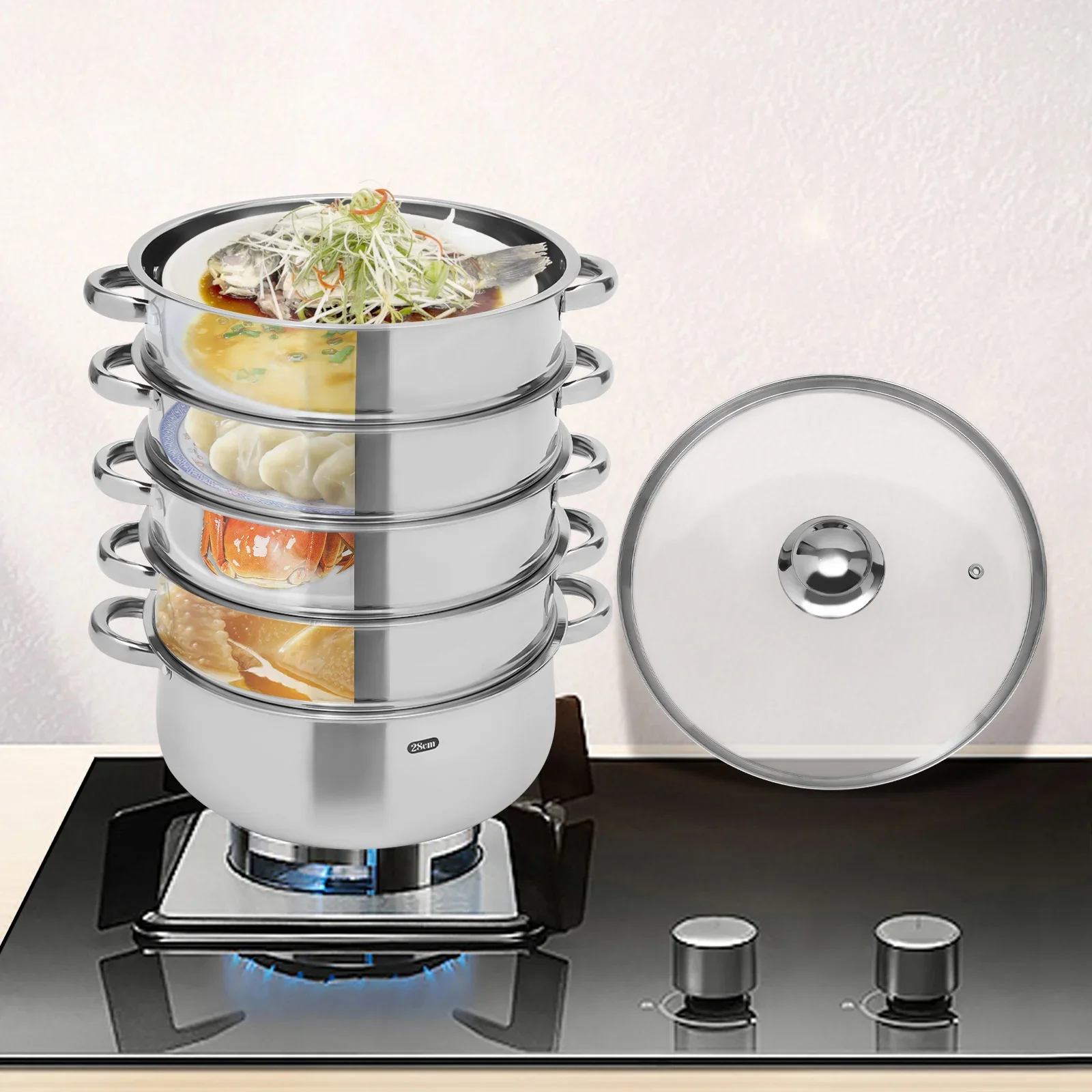 Strong Adaptability: Whether used on an induction cooker, an electric furnace, an electric ceramic stove or a gas stove, this 5-tier steamer can easily handle it.