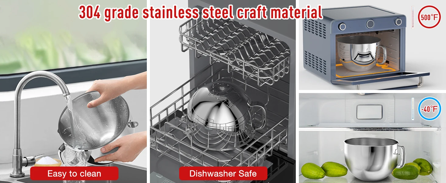 [Easy to clean]: This stainless steel mixing bowl for kitchenaid mixer accessories has a smooth surface and is not easy to adhere to food residue. This makes cleaning very easy, you can easily wash the mixing bowl by hand or put it in the dishwasher. Simple design Makes cleaning quick and easy, allowing you more time to focus on the fun of baking.