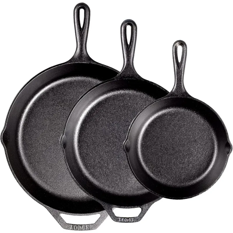 - Lodge Cast Iron 3-Piece Skillet Set includes an 8-inch, 10.25-inch, and 12-inch pre-seasoned cast iron skillets
