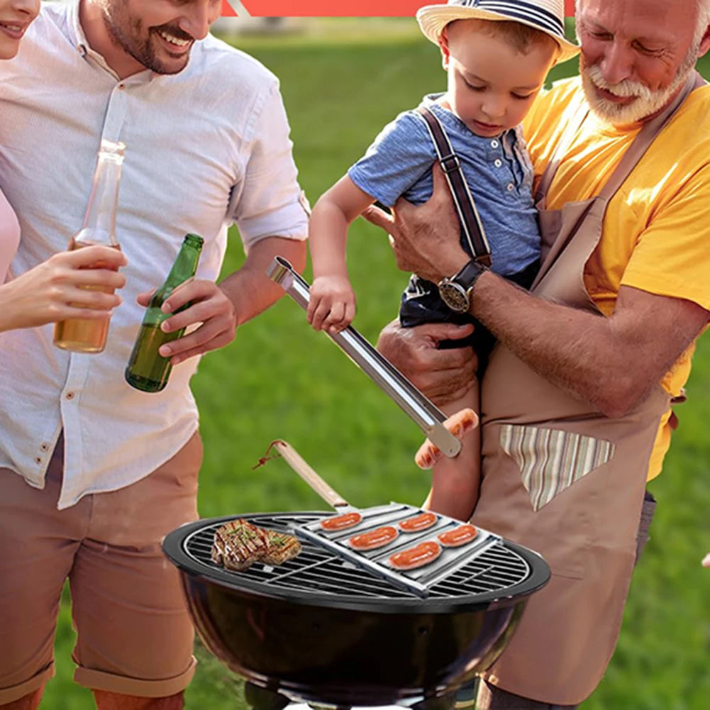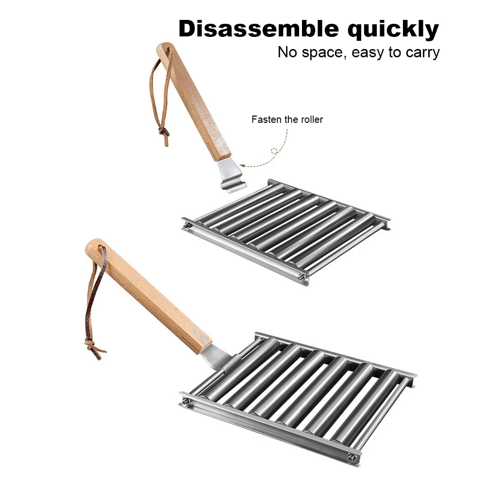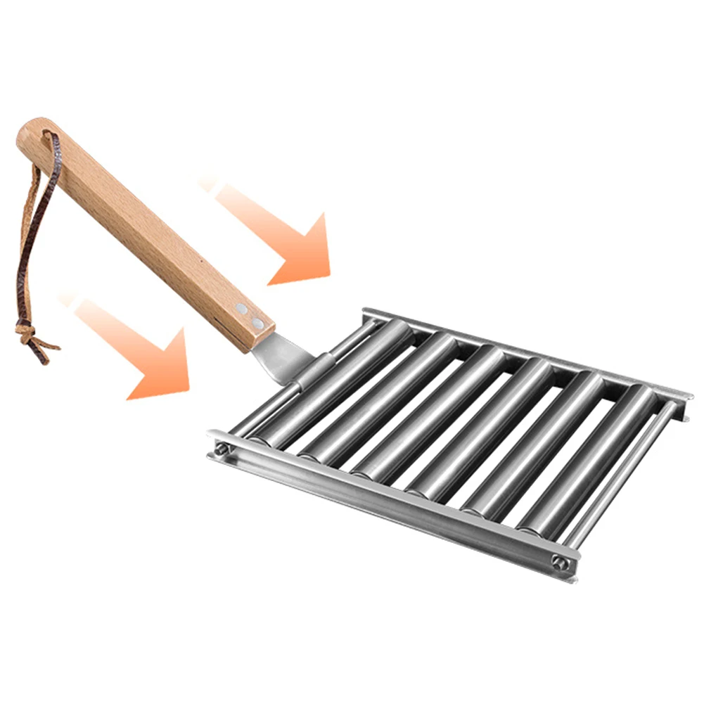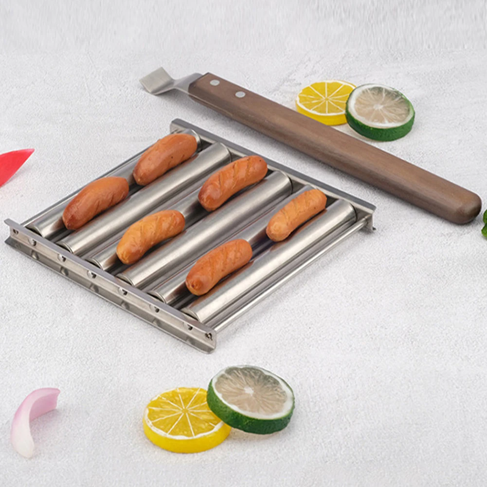 Stainless Steel Hotdog Roller Grill with Extra Long Wood Handle BBQ Hot Dog Griller Sausage Corn Roller Home Kitchen Barbecue Grilling Accessories